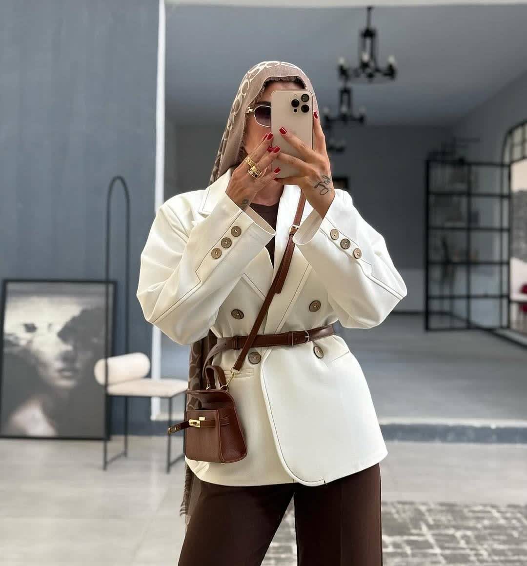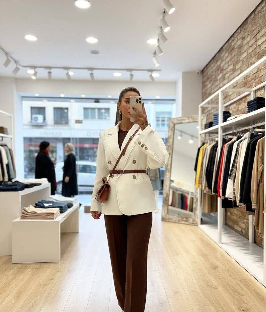 دستهبندی: نام محصول : کت وشلوارپناه كت جنس كرپ مارلين استايل اور خودش كمربند ساده سفيد داره ✔️ قیمت ۱۵۹۸ تركيب رودوزي قهوه اي و دكمه هاي چوبي چه ديتيل شيكي شد✨ خيلي ست شيكيه كلا تركيب سفيد و قهوه اي بي نظيره 🤎
